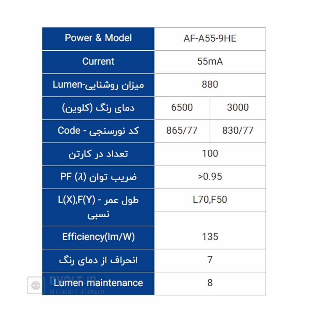 لامپ ال ای دی 880 لومن 6.5 وات سری پر بازده افراتاب مدل AF-A55-9HE پایه E27